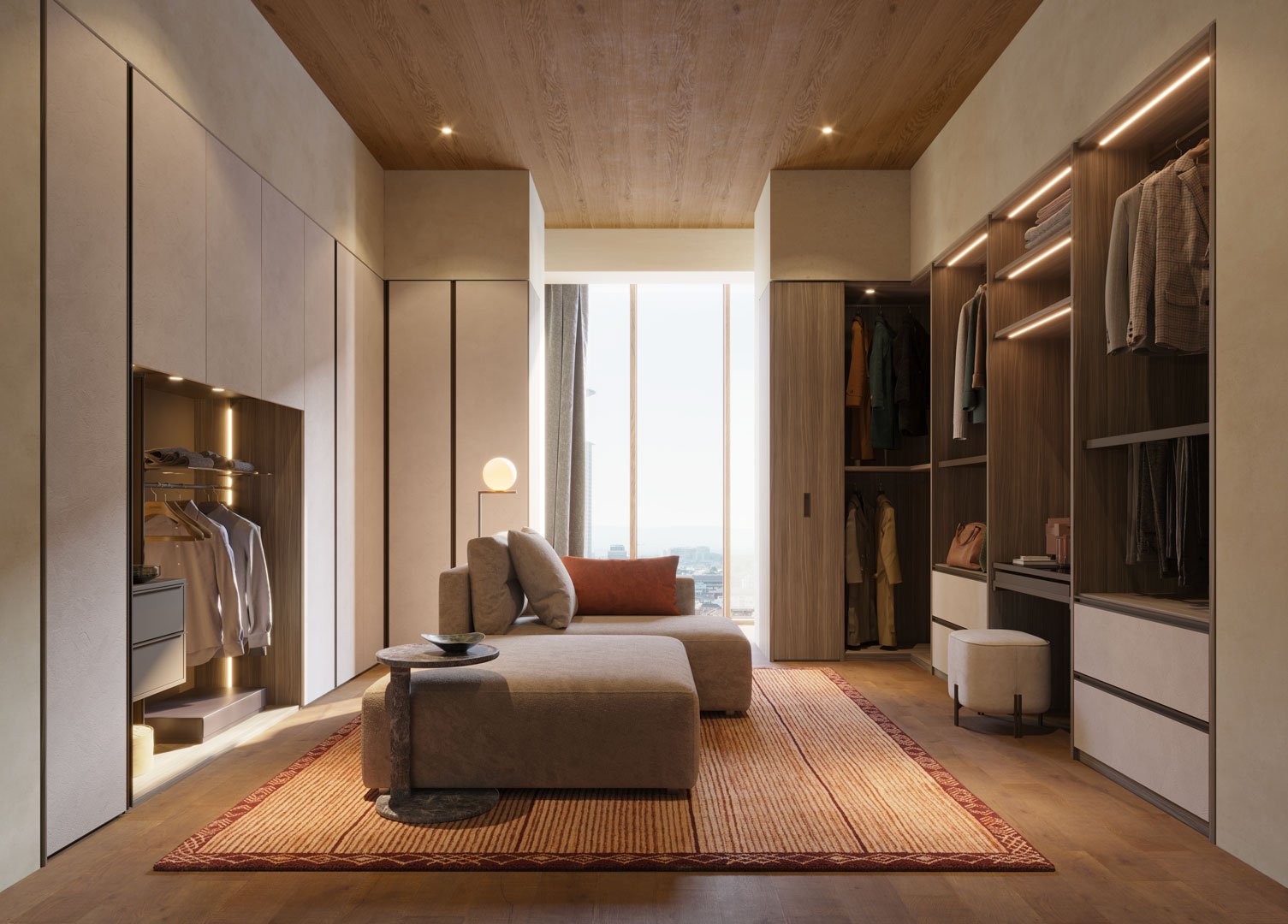 Era is an open-front walk-in wardrobe fitted with four large drawers, LED-lit shelves, a column with pull-out shoe shelves and a central make-up area including a touch-controlled mirror and jewellery box. The brightness and material feel of Whitewash create a happy contrast with the austere look of Oxidized Walnut. The project design includes a bridge wardrobe on the left side from the Night Collection and, in the centre of the room, an Infinity sofa from the Living collection.