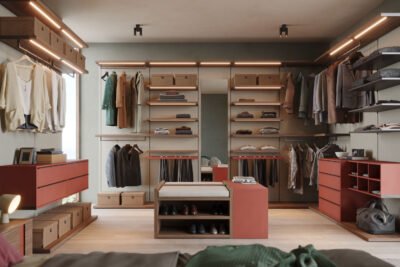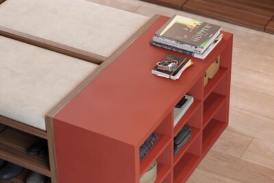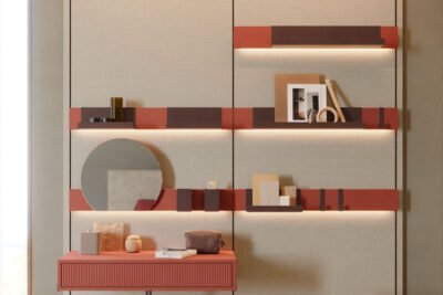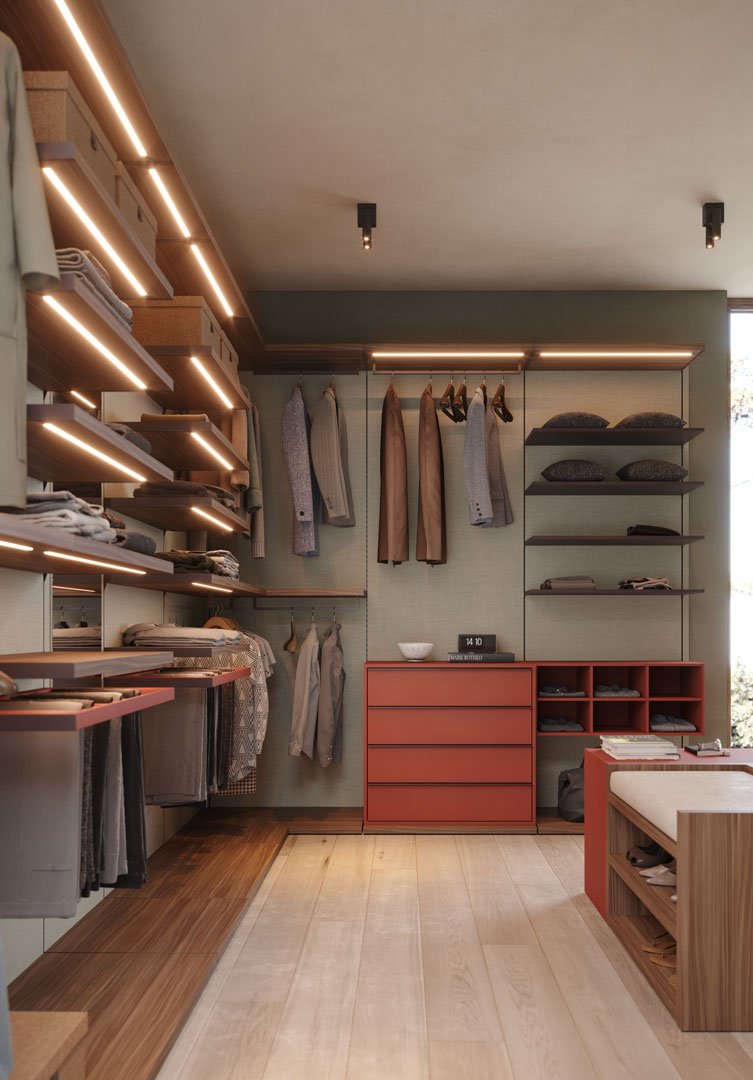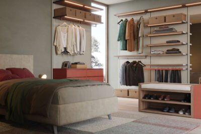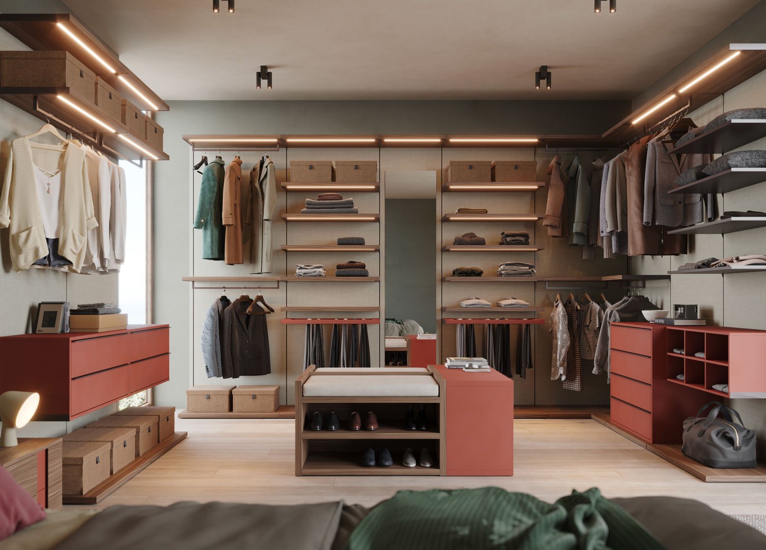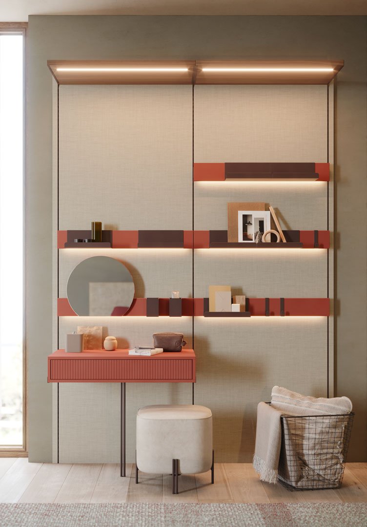 Artemide is a composition consisting of a walk-in wardrobe with panelling, LED-lit shelves, drawers and pull-out accessory holders. On the side, a part of the walk-in wardrobe is dedicated to a full make-up area with LED bars and accessory holders, a drawer-dressing table and a mirror. Conversely, in the centre of the room, there’s a bench and shoe rack and an end shelving unit for storing items. Some furniture pieces in this composition are painted in Brick lacquer to give an energizing and more youthful touch to the room, without compromising its overall harmonious feel.