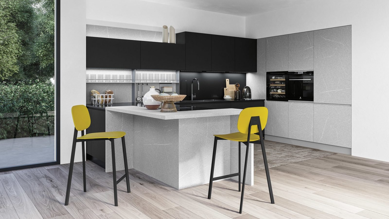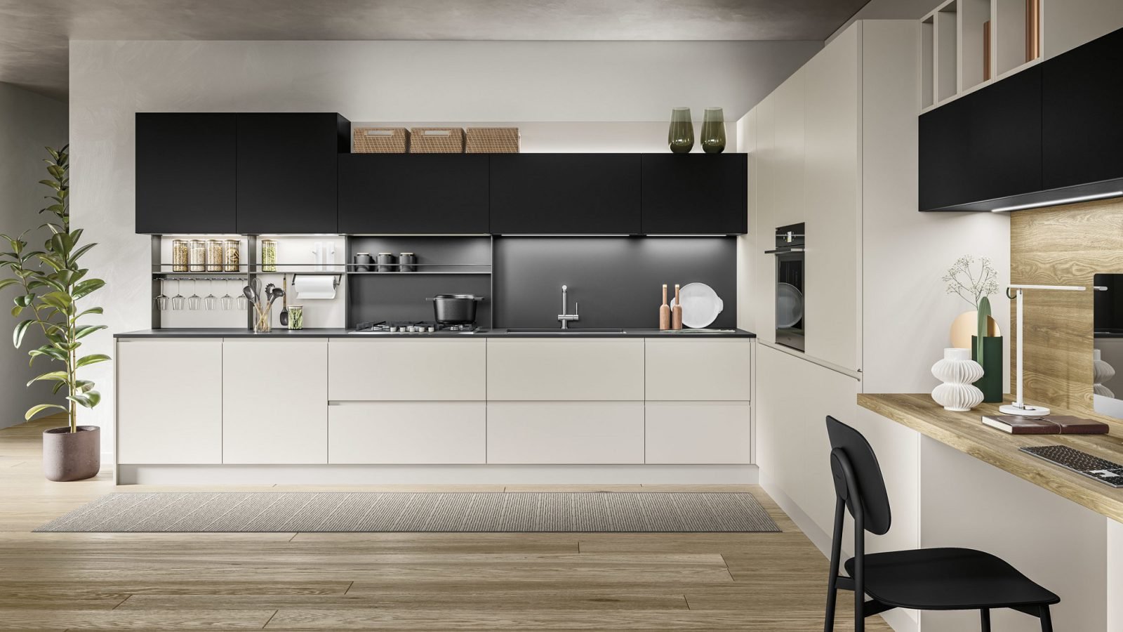 The integrated handle with the J-profile system—the handle par excellence—sets the tone from the start, giving the kitchen a youthful flavor with a design defined by pure lines. It’s thoroughly modern in its finishes: the elegance of matte lacquers and textured effects, the bright reflections of glossy lacquers, wood-like finishes—trends that speak to a return to natural elements.